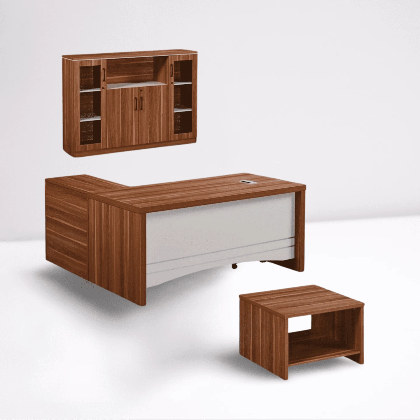 وبجانب ذلك، يحتوي الطقم على دولاب قصير يعمل كمكمل للمساحة، حيث يوفر تخزين إضافي للملفات والمستندات بشكل منظم وآمن. الدولاب مصنوع من مواد عالية الجودة توفر القوة والاستدامة، مما يجعلها استثمارًا طويل الأمد.